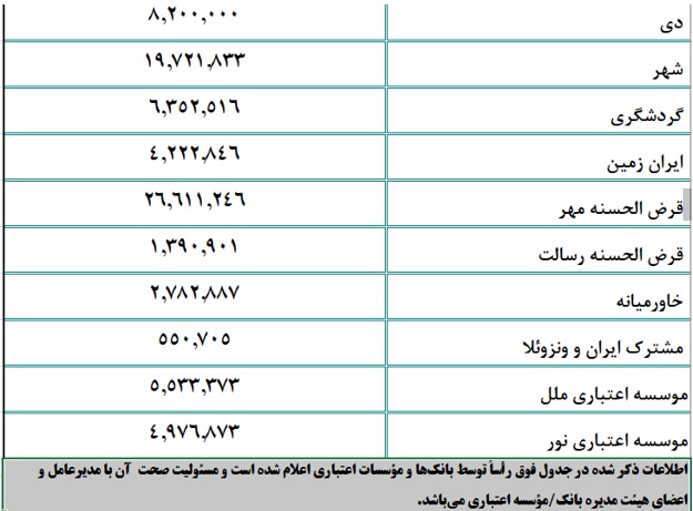 «اطلاعات ذکر شده در جدول فوق راسا توسط بانکها و موسسات اعتباری اعلام شده است و مسئولیت صحت آن با مدیرعامل و اعضای هیئت مدیره بانک یا موسسه اعتباری است»