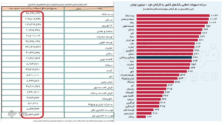 به نظر میآید بانکها این موارد را نادیده گرفته و اقدام به پرداخت تسهیلات یکسان به تمام کارکنان خود نمودند که طبق اطلاعات منتشر شده این تسهیلات در مجموع حدود ۱۶2 هزار میلیارد تومان است که در این بین بانکها و موسسات اعتباری بانک سپه با ۳۰ هزار میلیارد تومان در رتبه اول و سپس بانک ملی با ۲۴ هزار میلیارد تومان در رتبه دوم قرار دارد که البته تعداد کارکنان را نیز لحاظ نمود لذا اگر بخواهیم دقیقتر به موضوع نگاه کنیم باید سرانه وام هر کارمند را در بانک ها مقایسه نمایید که در این صورت بانک پست بانک ،صنعت و معدن و بانک رفاه دارای بیشترین سرانه پرداختی به کارکنان خود هستند.
